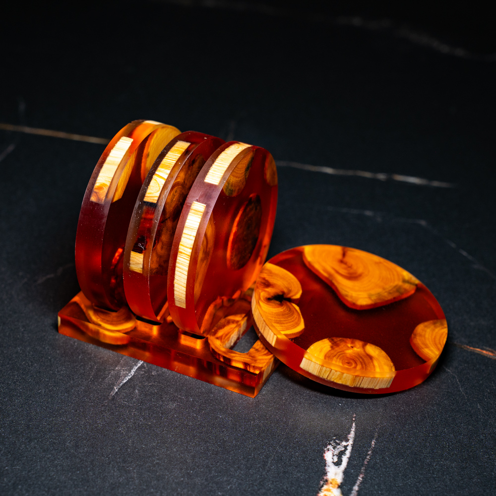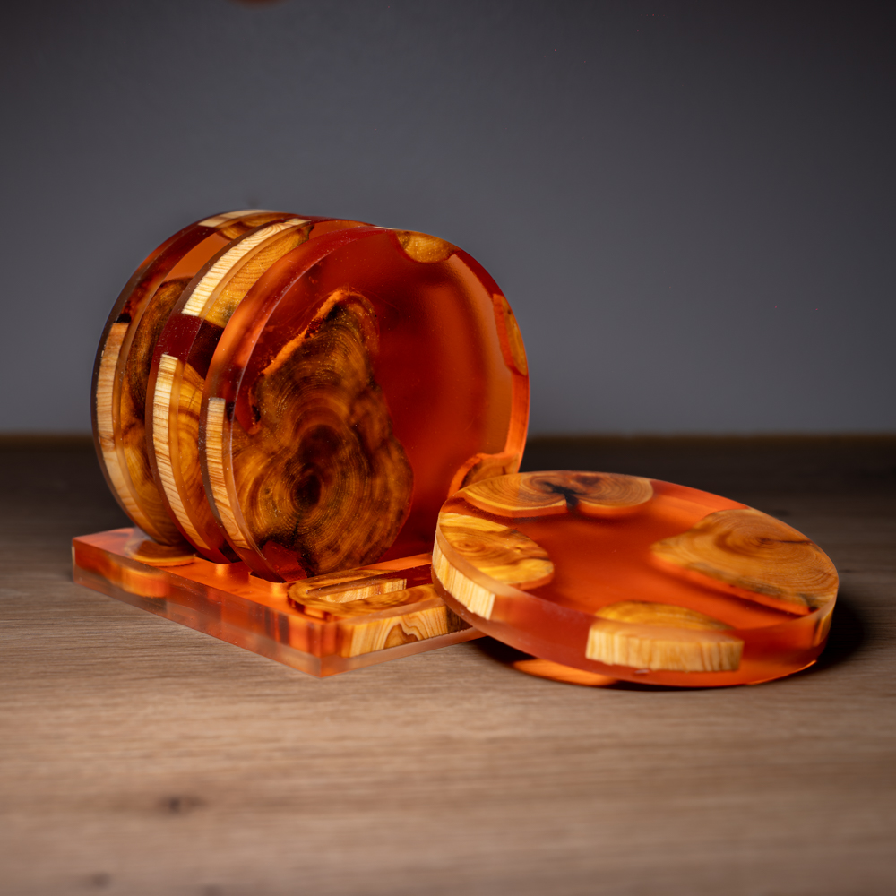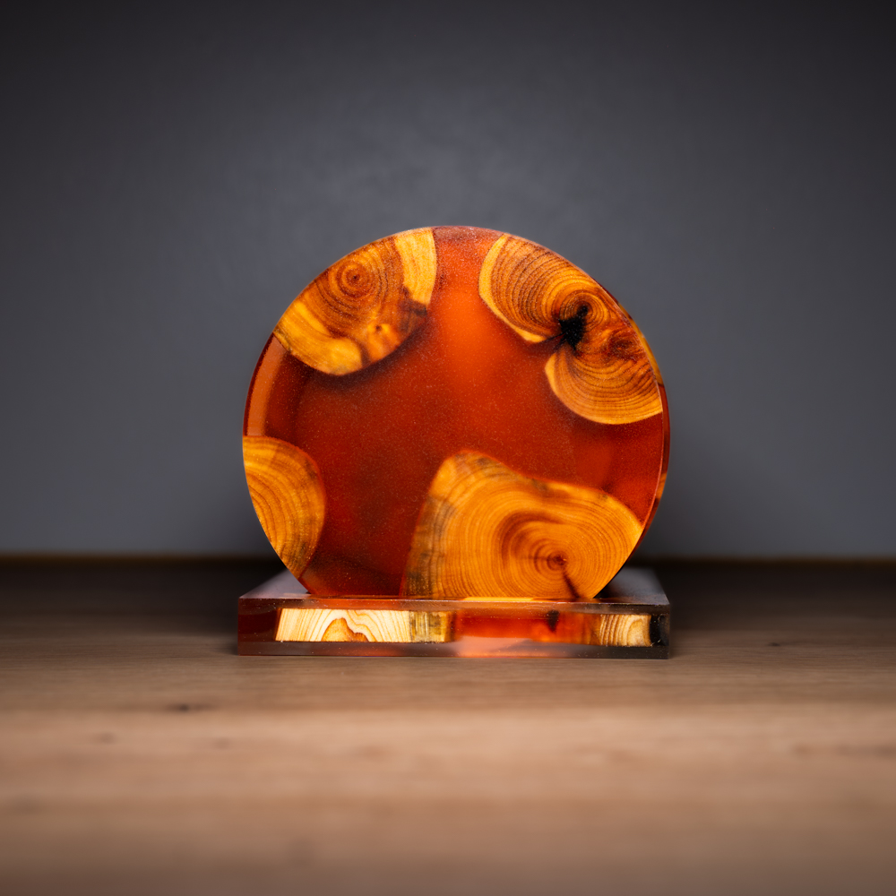 Joogialuste komplekt mis on tehtud käsitööna kasutades Eestimaist kadakat ja kõrgkvaliteedilist DIPON epoksiidi. Kaua kestev ja hõlpsasti puhastatav toode, mis toob kõneainet iga laua peale.