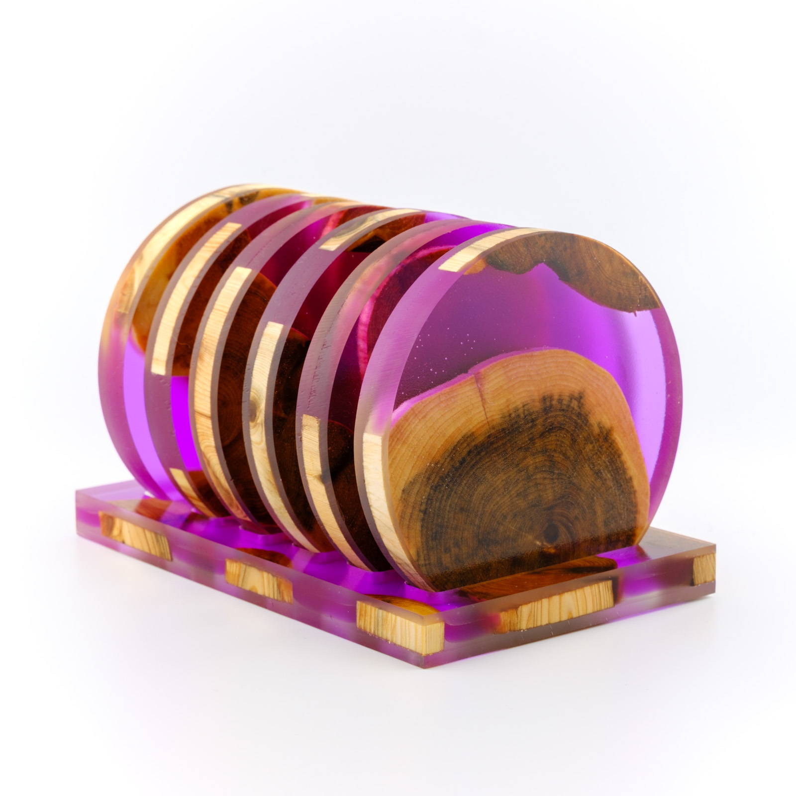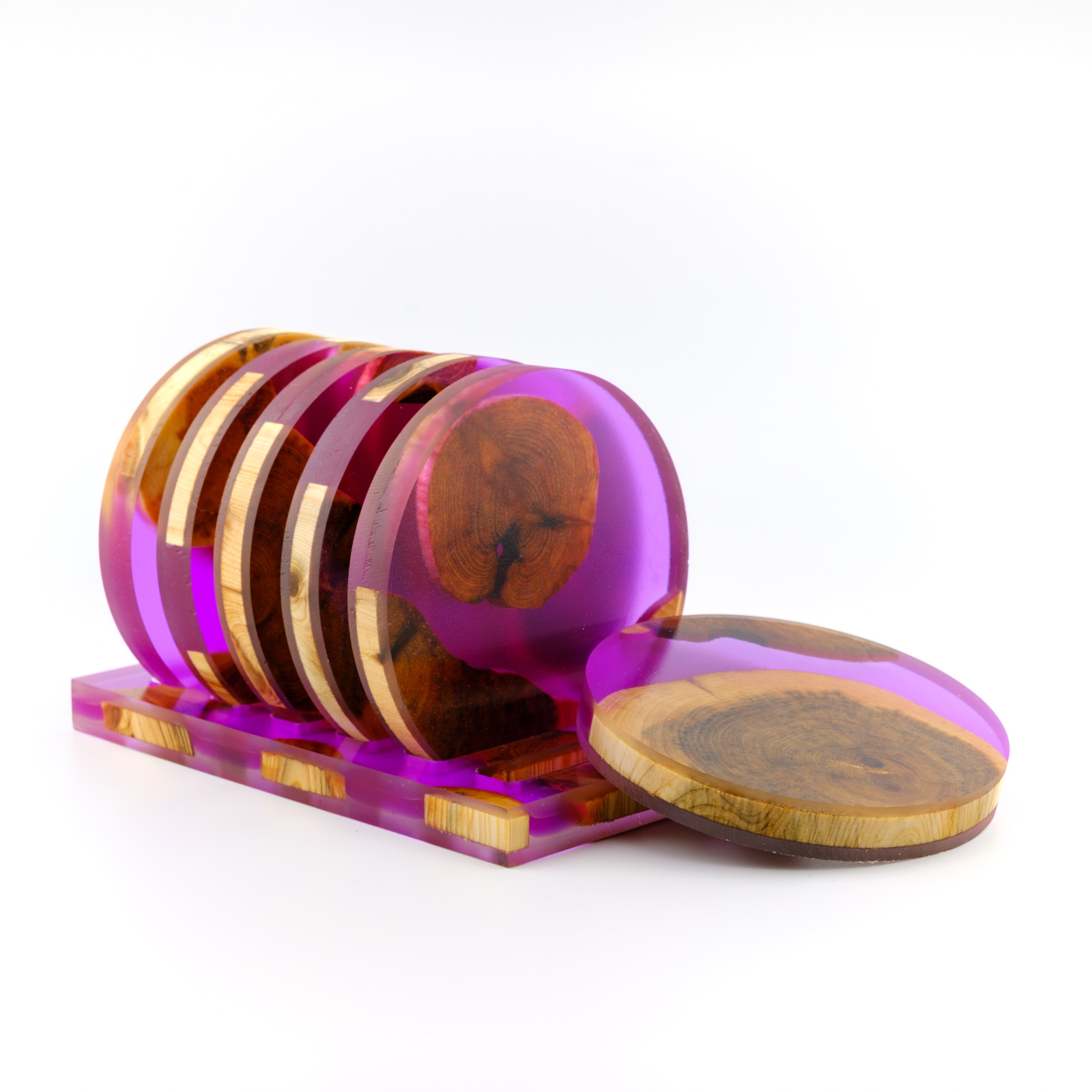 Joogialuste komplekt mis on tehtud käsitööna kasutades Eestimaist kadakat ja kõrgkvaliteedilist DIPON epoksiidi. Kaua kestev ja hõlpsasti puhastatav toode, mis toob kõneainet iga laua peale.